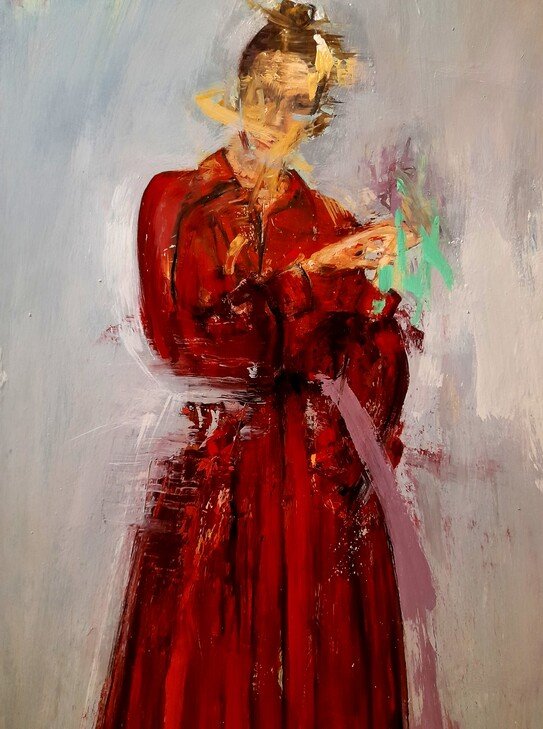 “FEMME EN ROUGE” / 65 x 52 cm (aprox) / Oil on advertising poster fixed on dibond / Huile sur affiche publicitaire fixée sur dibond / Óleo sobre cartel publicitario fijado sobre dibond